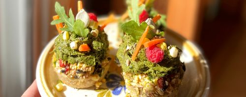 This surprise spurred me to get to know the geese on a more intimate level. So, as they unfurled their wings and began to feed, I planned a gift for them in conversation with Rowan and the rest of the What You See crew. Vegan suet, it turns out, is commonly used as a binding agent to make three dimensional shapes out of bird seed. So, I planned to make Goose Cupcakes: a decorated cupcake made from seed and other goose-friendly foods. I bought several types of nuts from the bulk foods section at my local grocer, and gathered grass from their feeding area to blend into a pipe-able icing for the cupcakes. After I shaped the nuts and seed in a muffin tin, I topped them with the icing, as well as sliced carrot, pumpkin seed and raspberry. I took several photos of the cupcakes to post to Instagram, where I was sure they would be a hit.