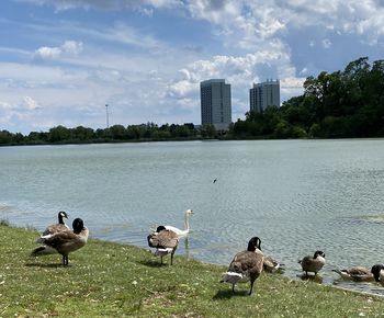 Grenadier Pond is a body of water located on the Western edge of Toronto's High Park. It is named after the local Town of York garrison of the 1800s and their use of the pond for fishing.[source wiki] On June 27, 2020, we (Simon Fuh, Rowan Lynch and Sameen Mahboubi) went to feed the geese there. Simon brought fresh uncooked corn cut from the cob, and Rowan and Sameen brought an assortment of greens including carrot tops, kale, and lettuce. The geese showed great interest in the corn, but did not eat the greens.